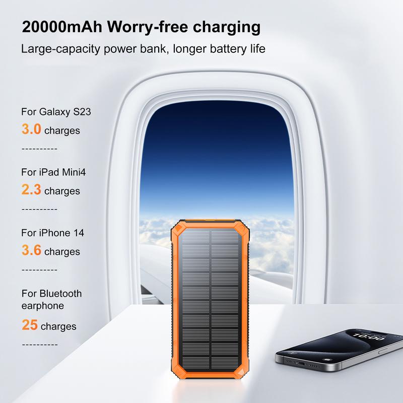 【20000mAh High Capacity Solar Battery Charger】Built-in 20000mAh lithium polymer battery pack; This portable power bank is widely used in outdoor enthusiasts, etc;Charge an iPhone se for 5 time, an iPhone 12mini for 3.8 time, and a iPad mini 5 for 2.7 time.