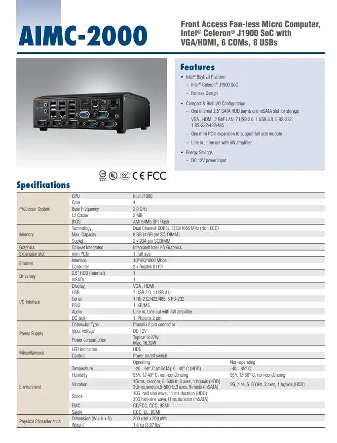 AIMC-2000 Fanless Embedded Industrial Computer Mini Industrial PC Quad-core J1900 SoC with VGA 6COM 8USB 2LAN DC-12V