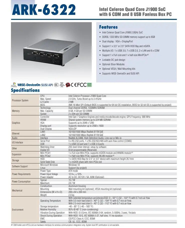 ARK-6322 Fanless Embedded Industrial Computer Mini Industrial PC Quad-core J1900 SoC with VGA 6COM 8USB 2LAN DC-12V