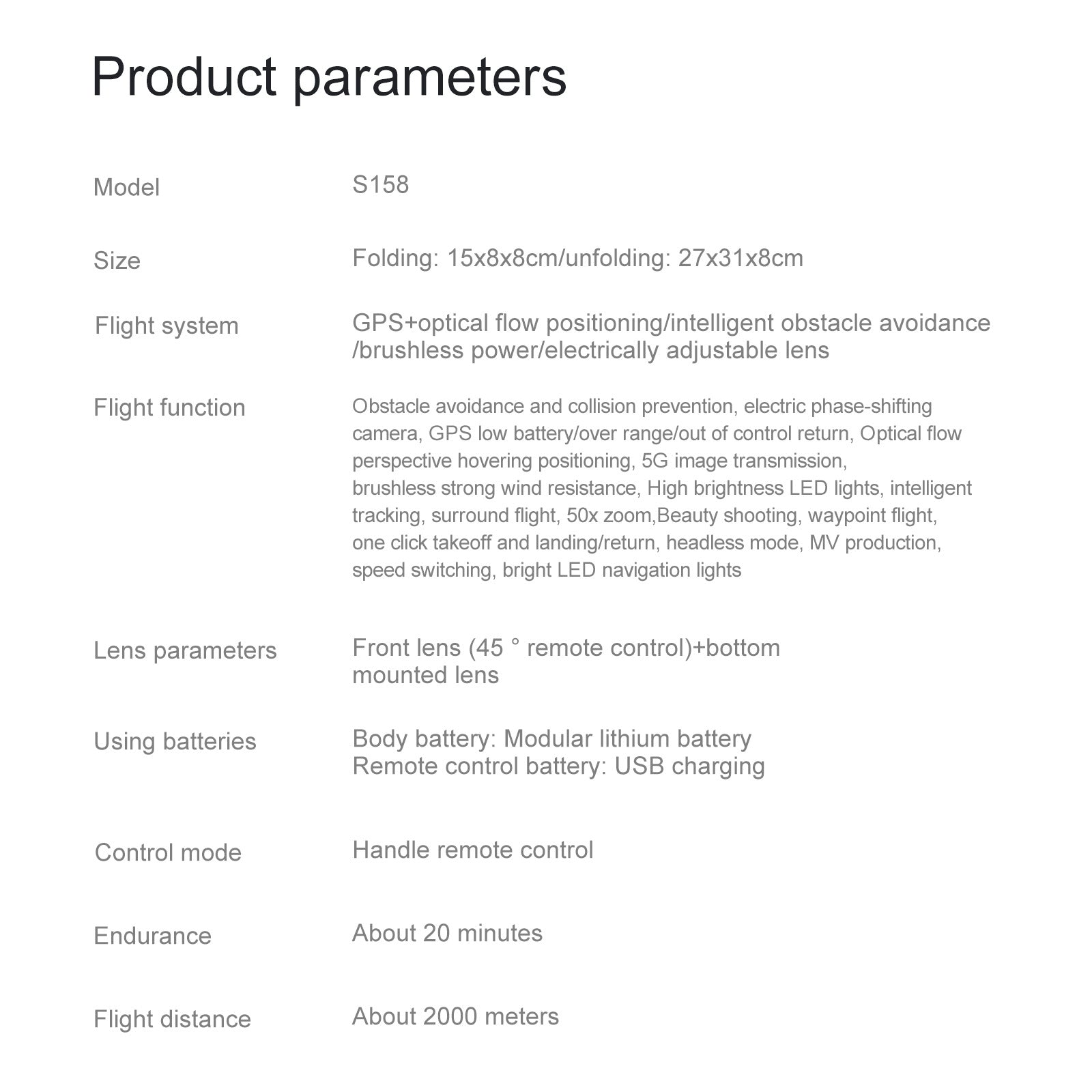 For specific drone parameters, please refer to the response from customer service; the e-commerce images are for reference only!