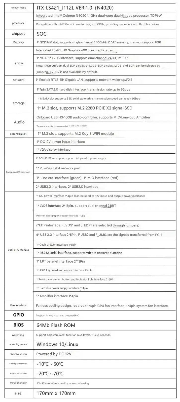 N4020 Mini-ITX Motherboard Celeron Intel CPU IPC SBC Embedded Fanless Ultra-thin Mainboard with 2*COM LAN LPT PS/2 DC-12V DDR4