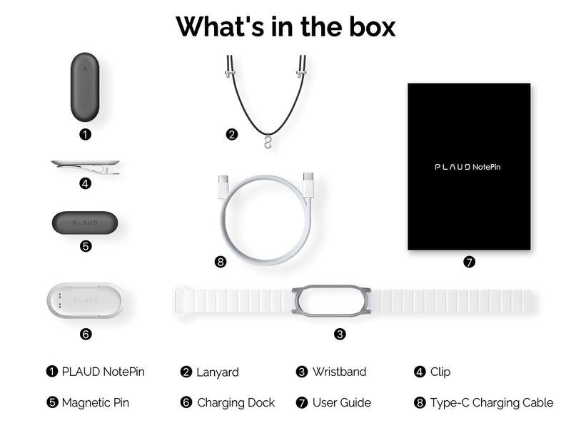 EVERYTHING YOU NEED IS INCLUDED: 1 PLAUD NotePin Voice Recorder, 1 Black Lanyard, 1 White Wristband, 1 Silver Clip, 1 Charging Dock, and 1 USB-C Charging Cable.All PLAUD users will enjoy a complimentary 300 transcription mins/month.