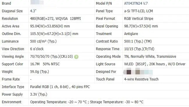 AT043TN24V.7 AT043TN25V.2 4.3-inch Original LCD Display Screen
