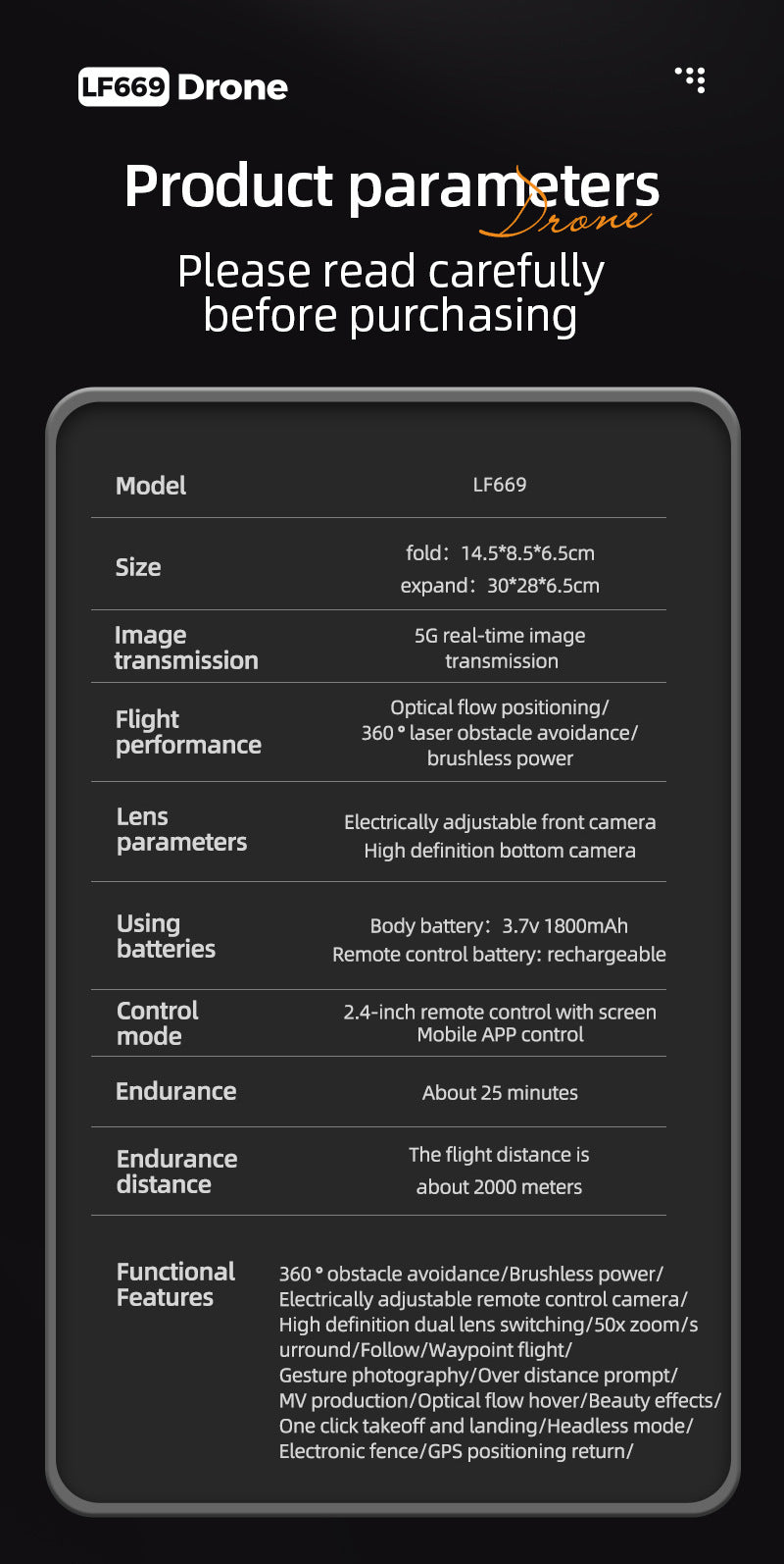 For specific drone parameters, please refer to the response from customer service; the e-commerce images are for reference only!