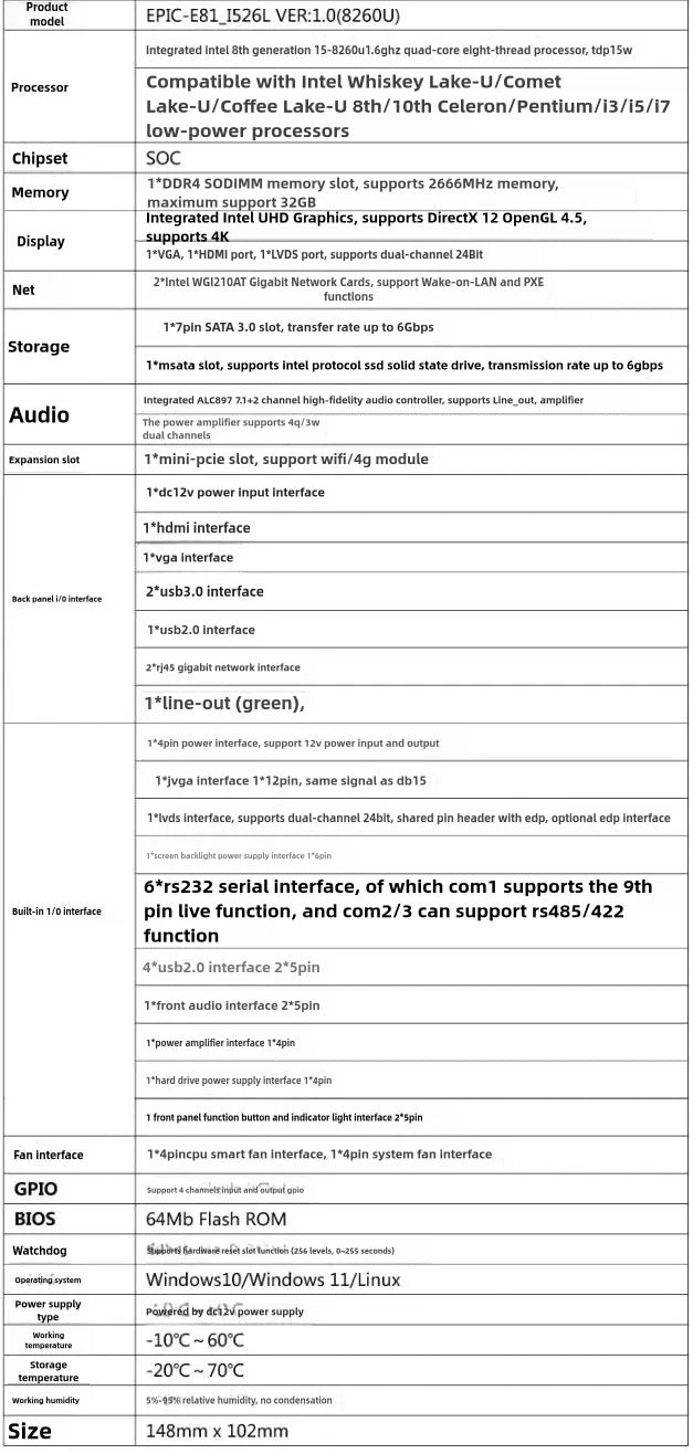 i5-8260U Motherboard 8th CPU Brand 3.5 Size IPC Embedded Mainboard SBC 3.5-inch Industrial with 6COM 2LAN DC-12V LVDS VGA DDR4
