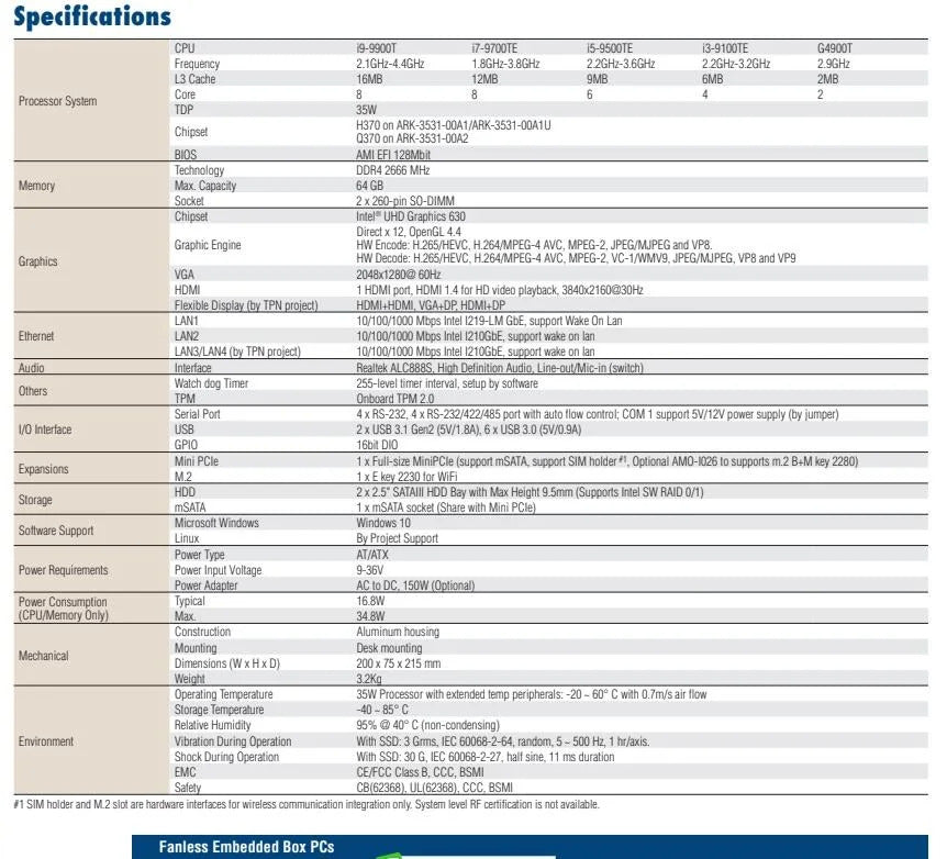 ARK-3531 Fanless Embedded Industrial Computer Mini Industrial 8th/9th Gen Core™ i3/i5/i7/i9 LGA1151 Box PC input 9-36VDC 4*LAN
