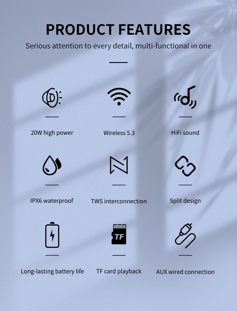 Multifunctional and Versatile: This speaker is equipped with features such as true wireless stereo interconnection for stereo sound, IPX6 waterproof rating for outdoor use, and supports various music playback modes including TF card, AUX wired input, and wireless.