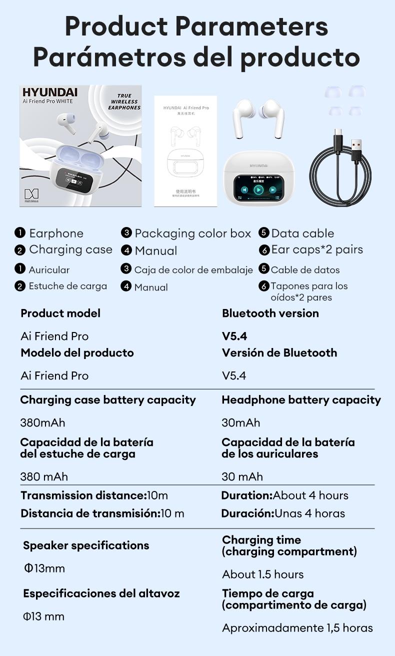 HYUNDAI Friend Pro Noise Reduction Headphones with Full Color Touch Charging Case, Robust Bass Stereo Audio Headset, IPX5 Waterproof & Anti-lost Search Function Earbuds