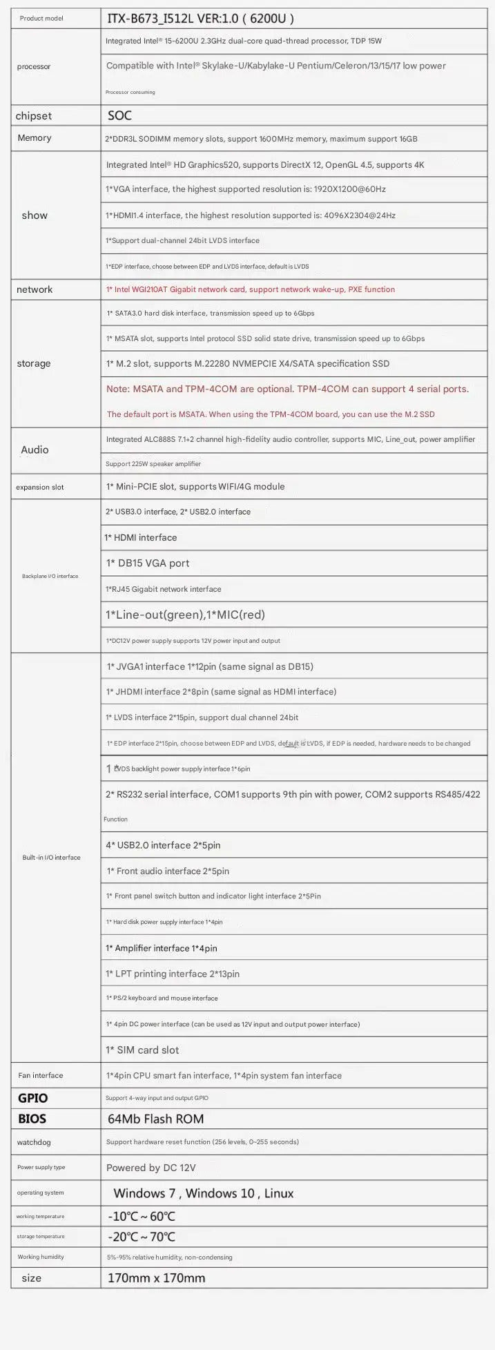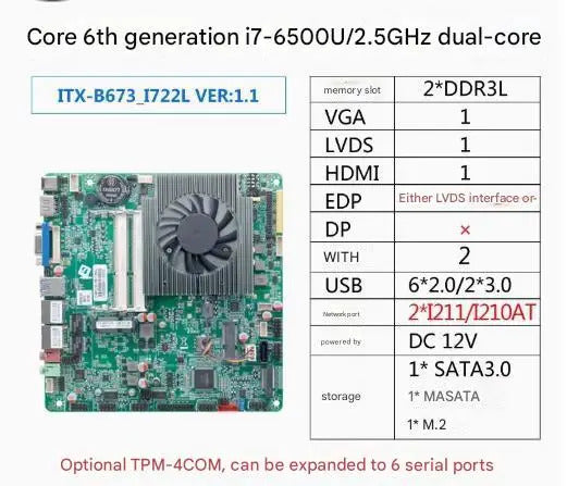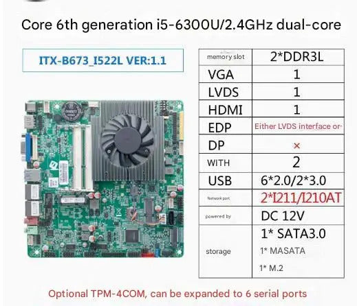 i5-6300u i7-6500u Mini-ITX Motherboard Core CPU IPC SBC Embedded Fanless Ultra-thin Mainboard with COM LPT PS/2 DC12V DDR3L LVDS