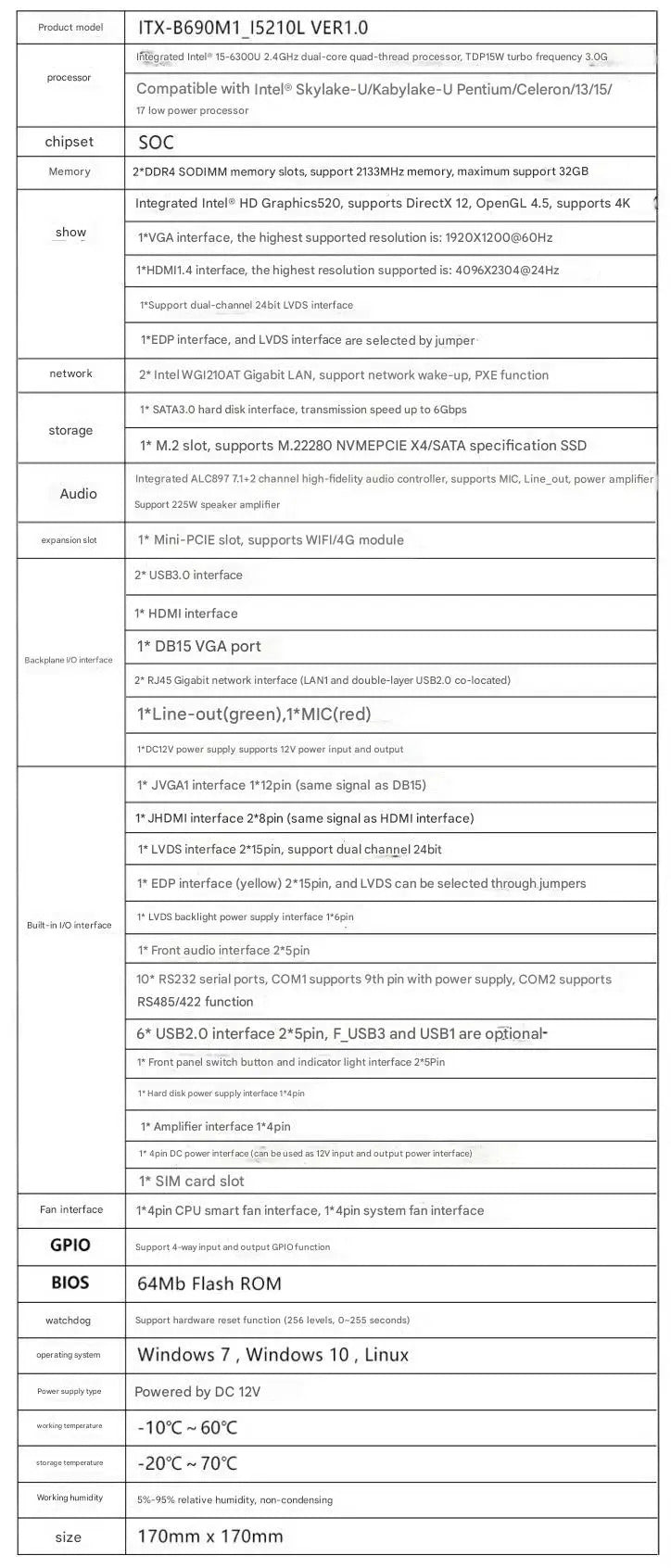 i5-6300u Mini-ITX Motherboard 6th Core Intel CPU IPC SBC Embedded Ultra-thin Mainboard with 10*COM 2*LAN DC-12V DDR4 LVDS EDP