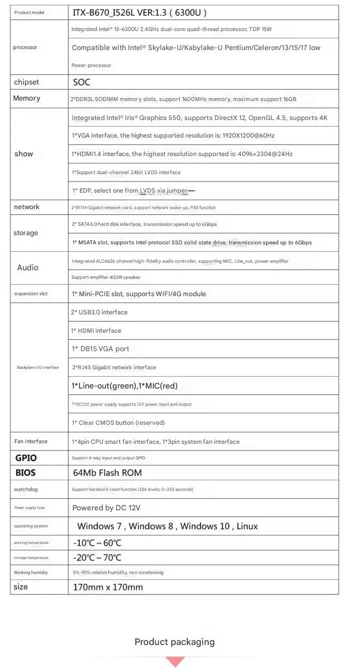 i5-7200u Mini-ITX Motherboard 7th Core Intel CPU IPC SBC Embedded Ultra-thin Mainboard with 2COM LAN DC12V DDR3L 6USB LVDS VGA