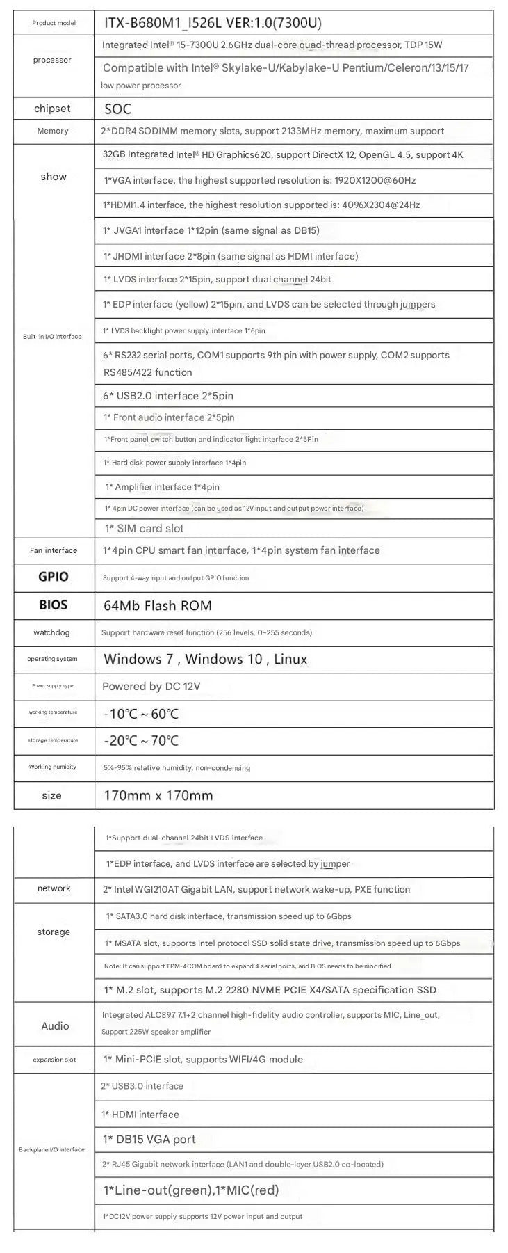 i5-7300u Mini-ITX Motherboard 7th Core Intel CPU IPC SBC Embedded Ultra-thin Mainboard with 6COM 2LAN i210 DC12V DDR4 8USB LVDS