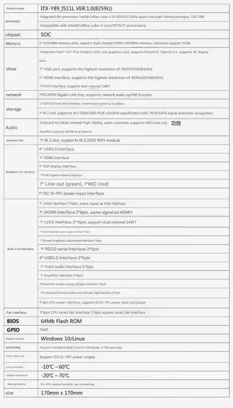 i5-8259u Mini-ITX Motherboard 8th Core Intel CPU IPC SBC Embedded Ultra-thin Mainboard with COM LAN DC12V DDR4 8USB LVDS VGA