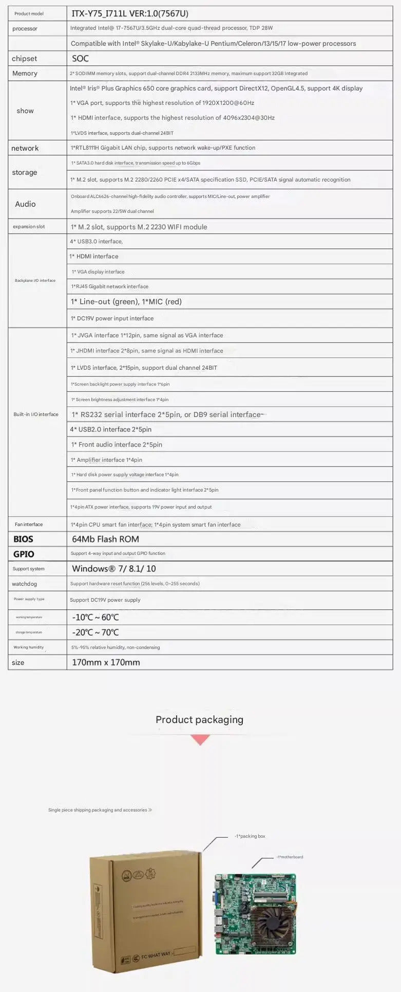 i7-7567u Mini-ITX Motherboard 7th Core Intel CPU IPC SBC Embedded Ultra-thin Mainboard with COM LAN DC-19V DDR4 LVDS EDP